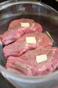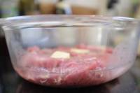 - Poser par dessus les morceaux de beurre, verser 1/2 tasse d'eau chaude et enfourner à 180 °C pendant 1 h 45 minutes environ jusqu'à ce que la viande colore et devienne tendre