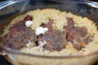 - Recouvrir la viande et le riz avec le mélange de yoghourt, verser le beurre clarifié par dessus